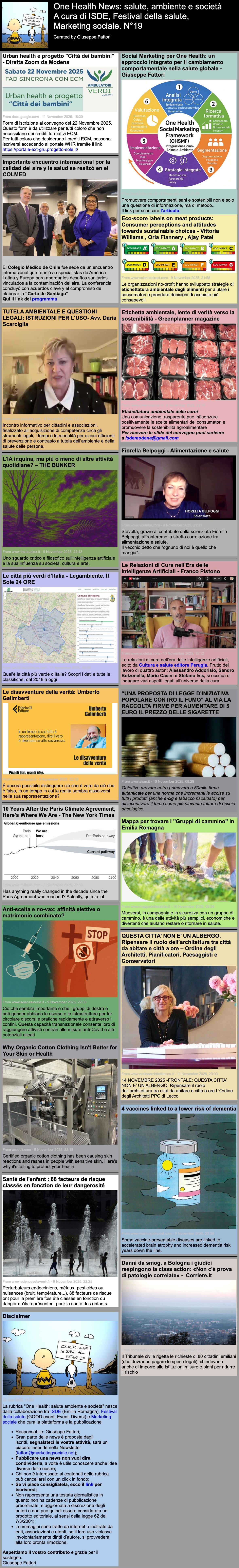 One Health News: salute, ambiente e società – A cura di ISDE, Festival della salute, Marketing sociale. N°19 Immagine Posted on 12 novembre 2025 by Giuseppe Fattori Condividi: Fai clic per condividere su X (Si apre in una nuova finestra) X Fai clic per condividere su Facebook (Si apre in una nuova finestra) Facebook Mi piace Caricamento... Correlati