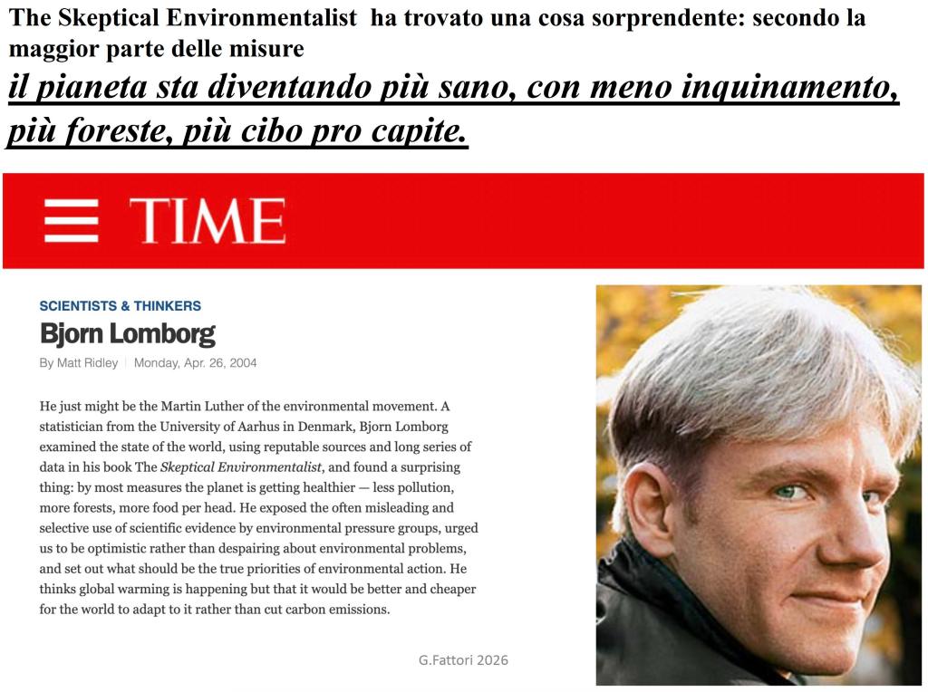 Il caso più articolato in questa sezione è quello di Bjorn Lomborg, economista danese già direttore dell’Istituto danese di valutazione ambientale, nominato da Time tra le cento persone più influenti al mondo nel 2004. Il suo libro The Skeptical Environmentalist sostiene che, secondo la maggior parte degli indicatori disponibili, il pianeta stia diventando più sano — meno inquinamento, più foreste, più cibo pro capite. Il suo successivo False Alarm argomenta che le politiche climatiche più drastiche costano trilioni di dollari per risultati minimi, danneggiando soprattutto i più poveri, e che il cambiamento climatico andrebbe trattato come un problema serio ma non come un’emergenza esistenziale. Lomborg critica apertamente chi definisce il clima la più grande minaccia per la salute pubblica del nostro tempo, citando i dati: le malattie cardiache uccidono il 33% degli americani, il cancro il 26%, il caldo lo 0,31% — in calo — e le condizioni meteorologiche estreme lo 0,015%.