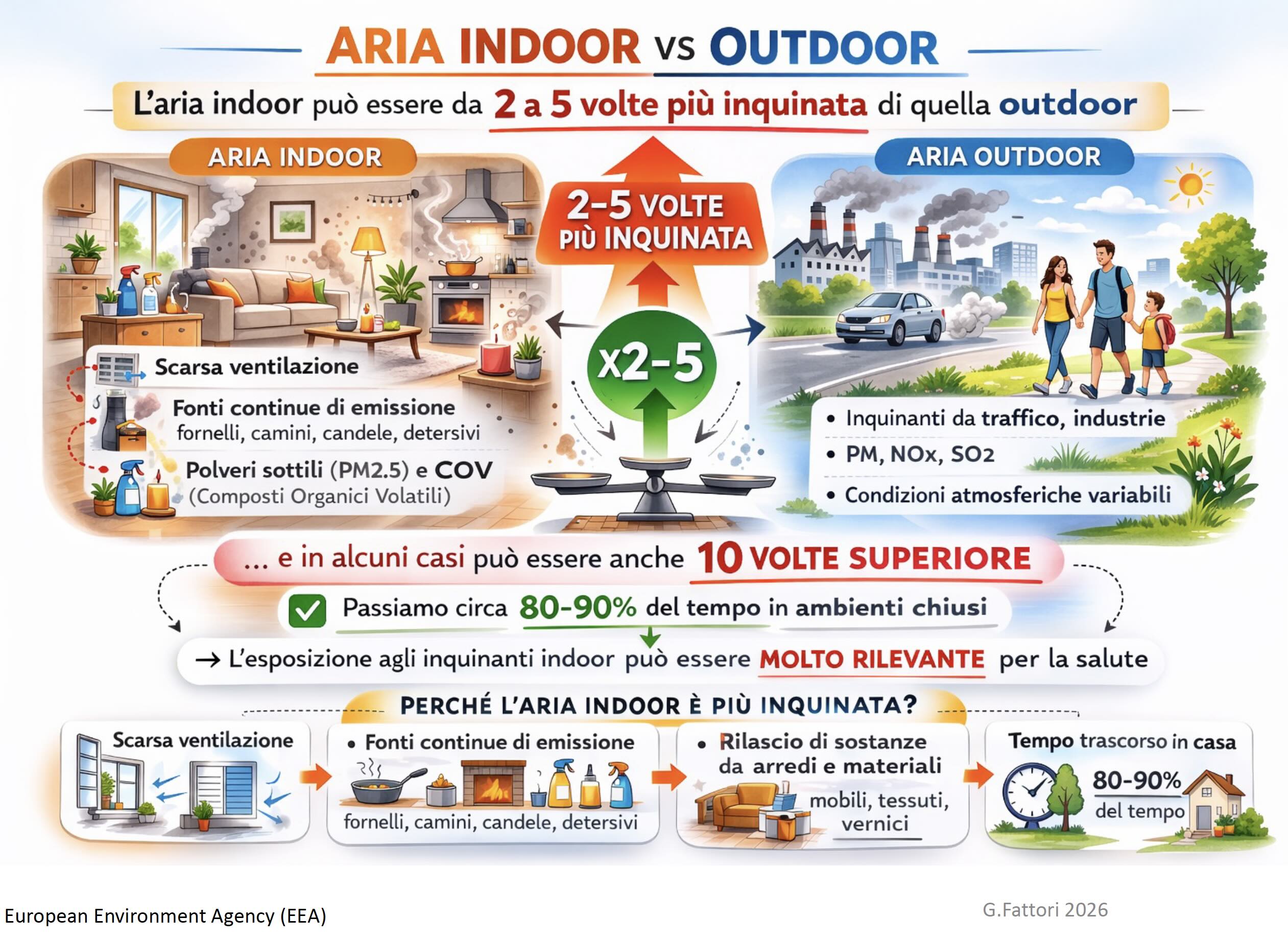 Viene richiamato anche lo studio NHAPS (National Human Activity Pattern Survey), che stima come le persone trascorrano in media circa il 90% del tempo in ambienti chiusi. Questo dato è cruciale: l’inquinamento che respiriamo non è solo quello delle strade, ma anche quello degli interni — aria che si accumula, che circola poco, che porta con sé pollini, polveri sottili, composti organici volatili.