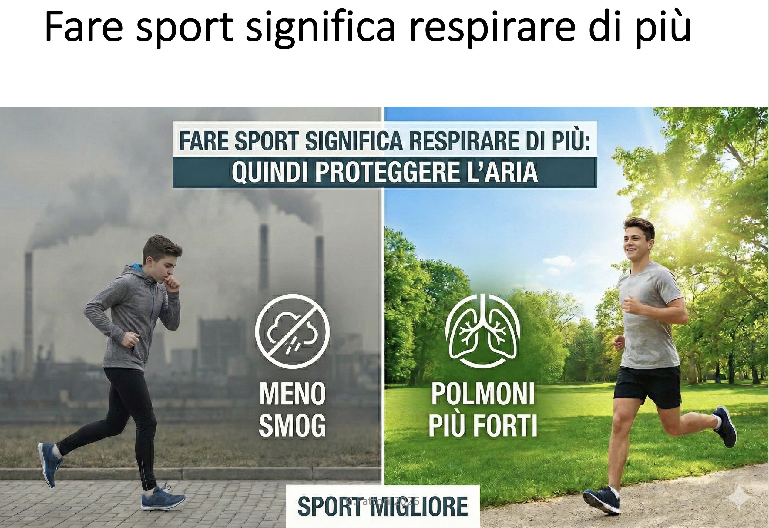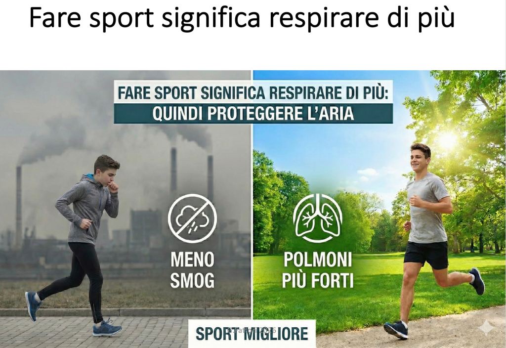 L’ultima slide è lapidaria: fare sport significa respirare di più. Non è un avvertimento che vuole scoraggiare — è il motivo per cui la qualità dell’aria che respiriamo non è una questione astratta, ma una questione personale e urgente.
