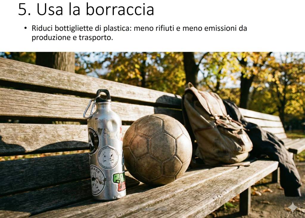 - Usa la borraccia: meno bottigliette di plastica, meno rifiuti, meno emissioni da produzione e trasporto.