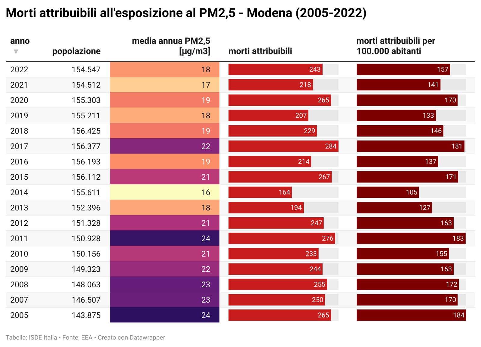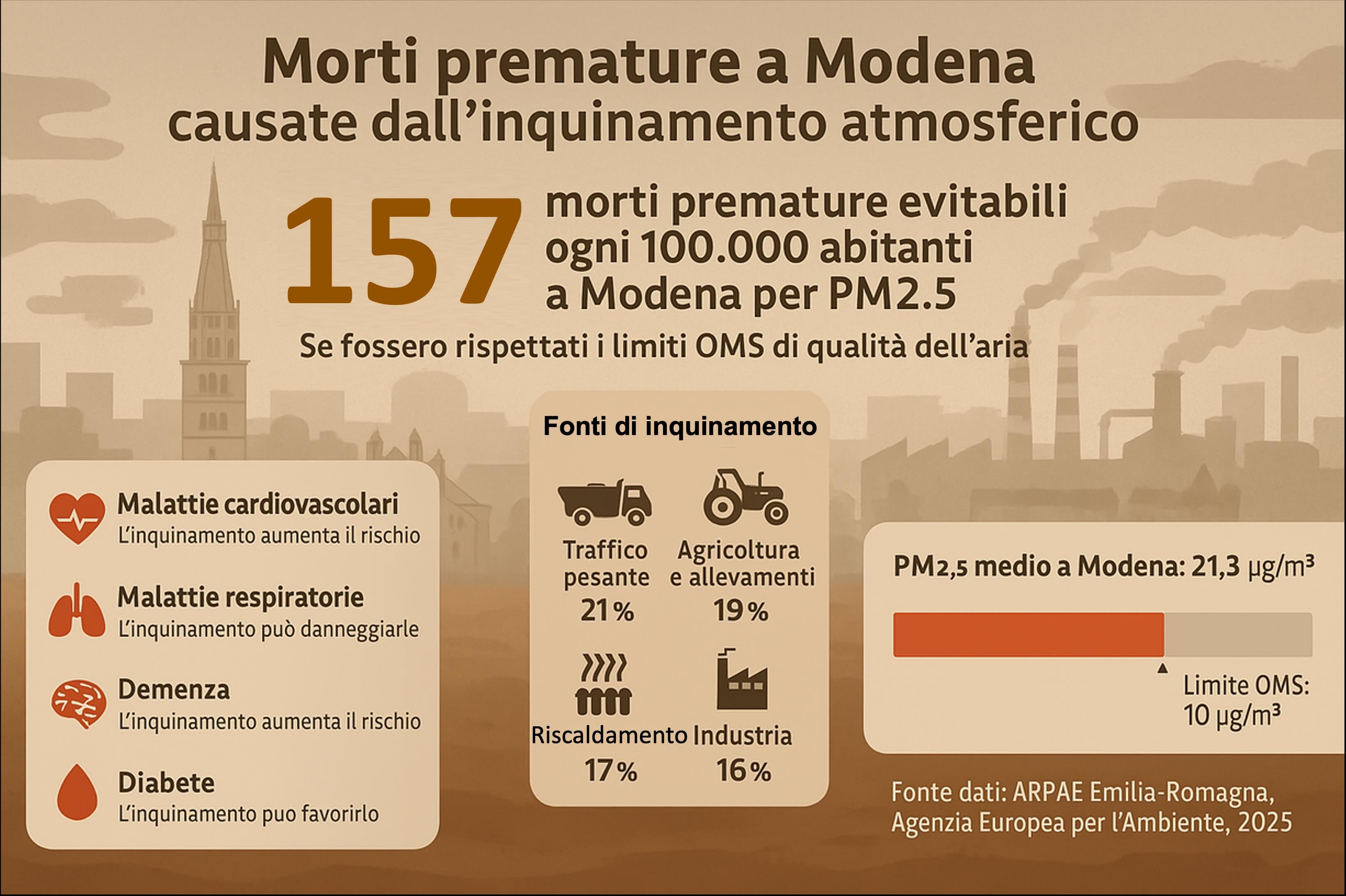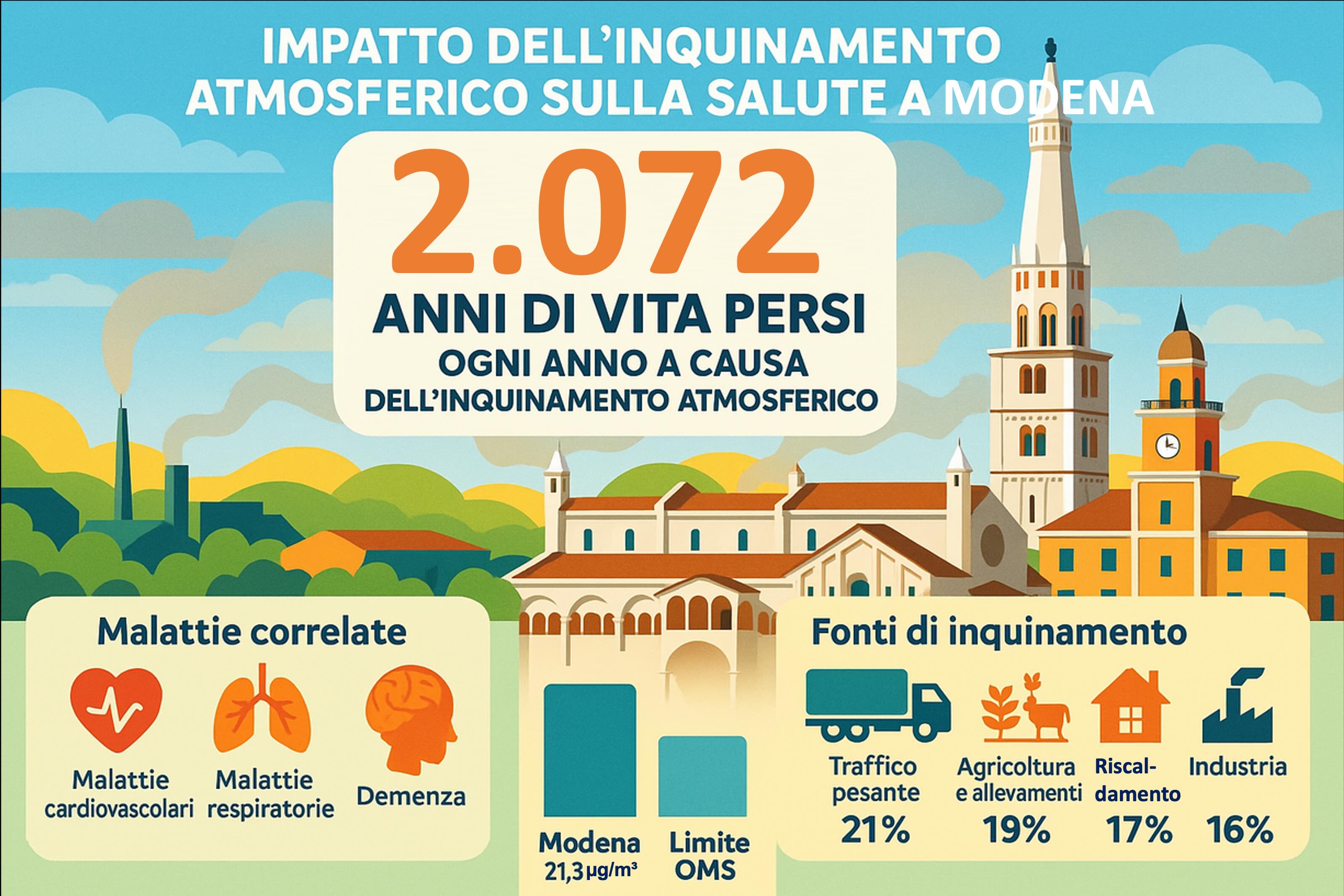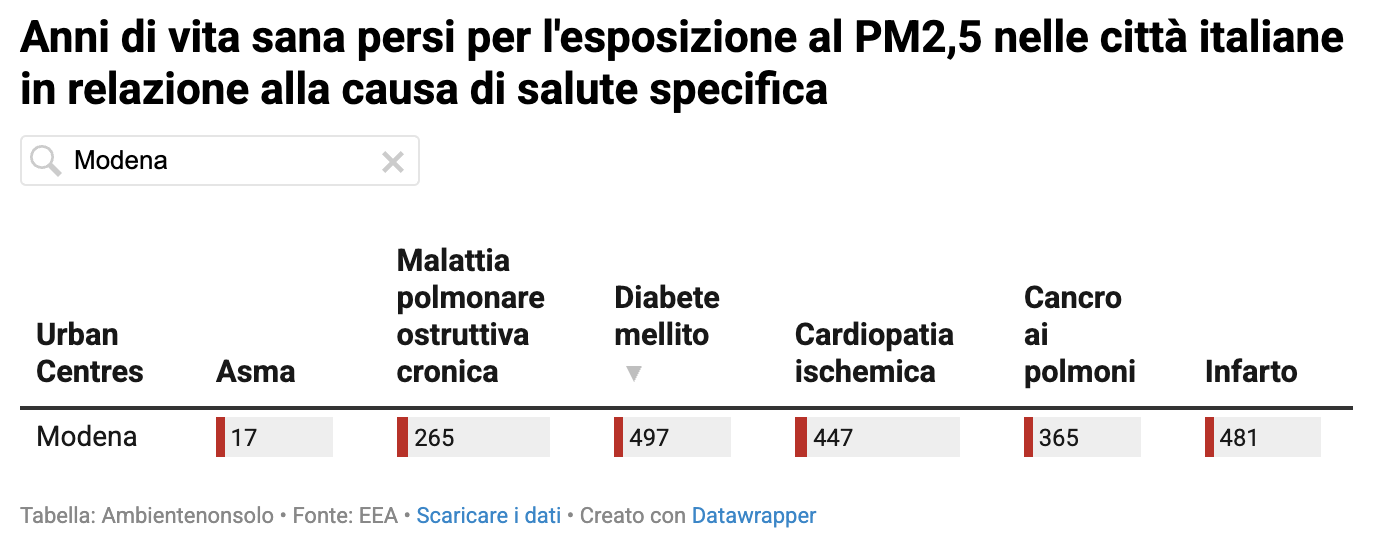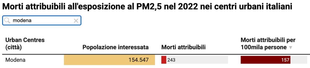 Queste informazioni sono precedute da infografiche sugli anni di vita persi e sulle morti premature a Modena a causa dell’inquinamento atmosferico.