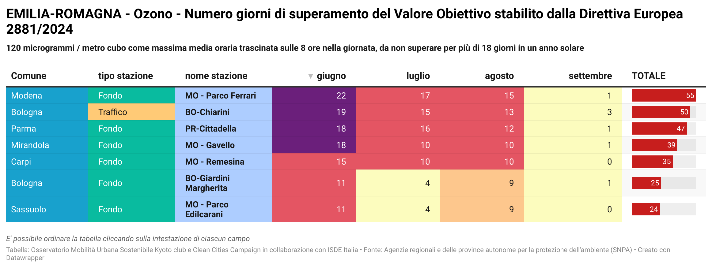 - EMILIA-ROMAGNA – Ozono – Numero giorni di superamento del Valore Obiettivo stabilito dalla Direttiva Europea 2881/2024 – Giugno