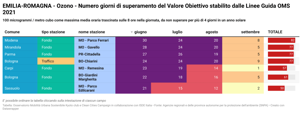 Nei mesi caldi emerge un altro nemico dell’aria: l’ozono troposferico, che si forma quando gli inquinanti da traffico e riscaldamento reagiscono con l’irraggiamento solare. Al Parco Ferrari Modena ha registrato 55 superamenti del limite fissato dalla Direttiva europea, che ne consente solo 18, e 82 superamenti rispetto alla soglia OMS, decisamente più restrittiva (solo 4 giorni tollerati). Questi livelli non solo creano irritazione alle vie respiratorie, ma possono aggravare asma e malattie polmonari croniche.