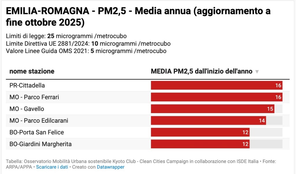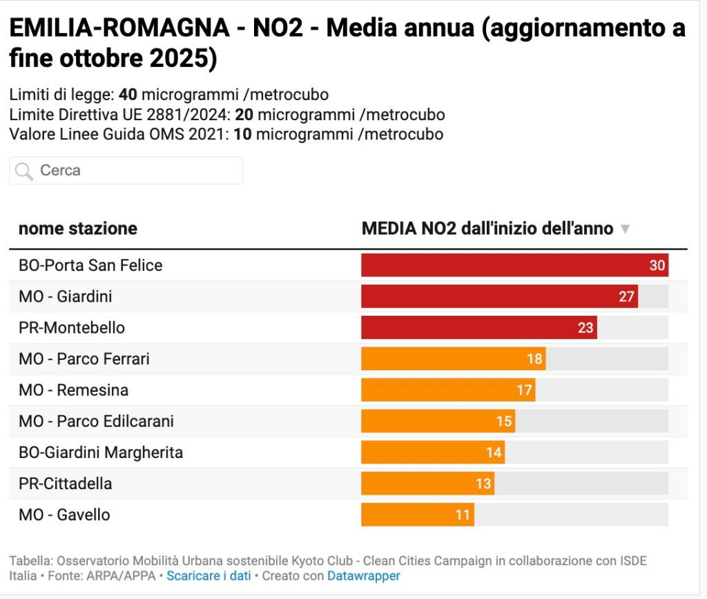 Il PM10 è l’indicatore più immediato dello stato dell’aria. La Direttiva UE consente al massimo 18 giornate oltre il limite in un anno; l’OMS ne tollera 4. A Modena la stazione di traffico MO-Giardini ha già totalizzato 31 giorni di superamento entro ottobre, mentre la stazione di fondo del Parco Ferrari ne conta 21. Significa che il particolato grossolano resta elevato non soltanto lungo le arterie più esposte, ma anche in aree residenziali e verdi, dove ci si aspetterebbe livelli più bassi. Ogni giorno oltre soglia corrisponde a un aumento del rischio per l’apparato respiratorio e cardiovascolare.