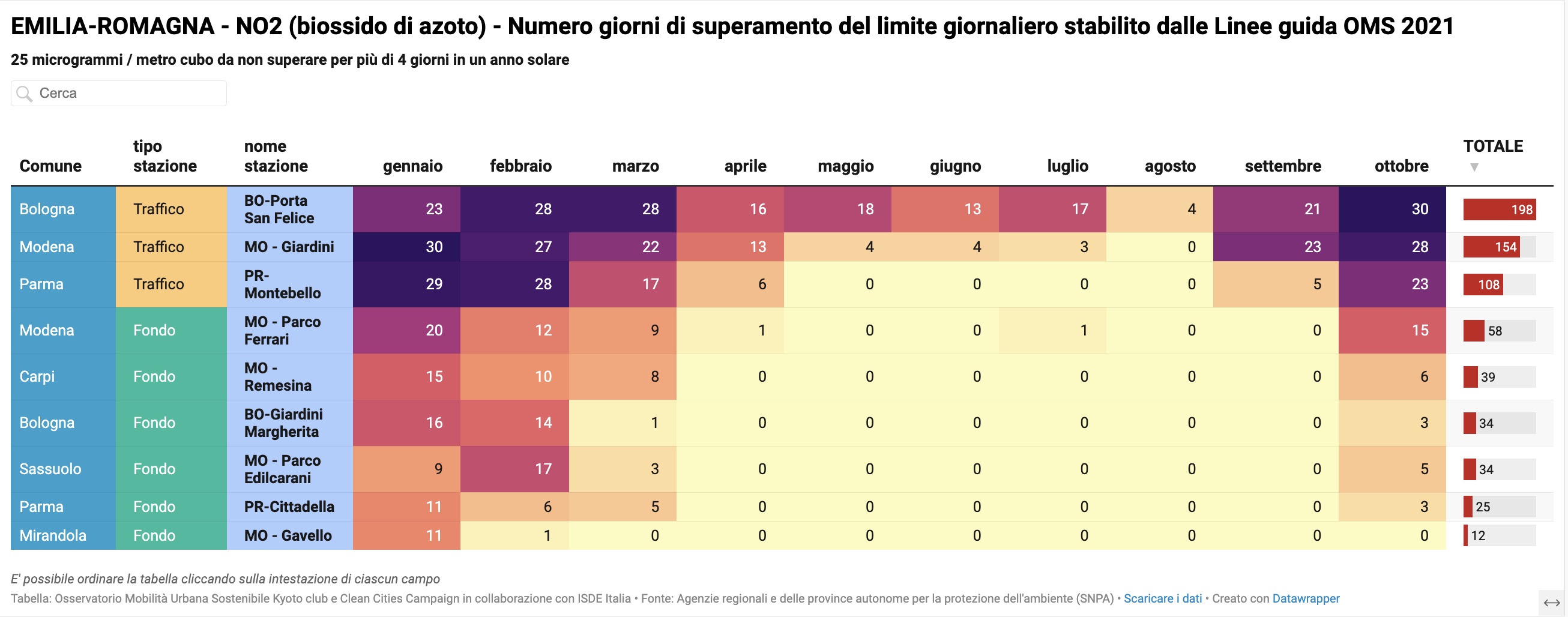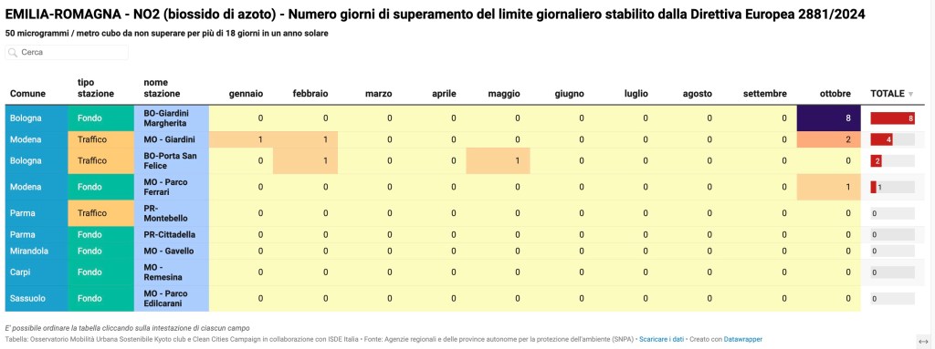 - EMILIA-ROMAGNA – NO2 (biossido di azoto) – Numero giorni di superamento del limite giornaliero stabilito dalla Direttiva Europea 2881/2024