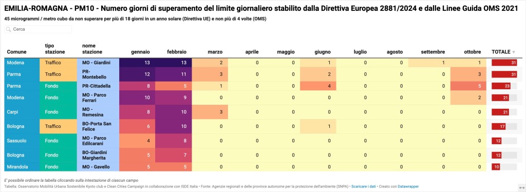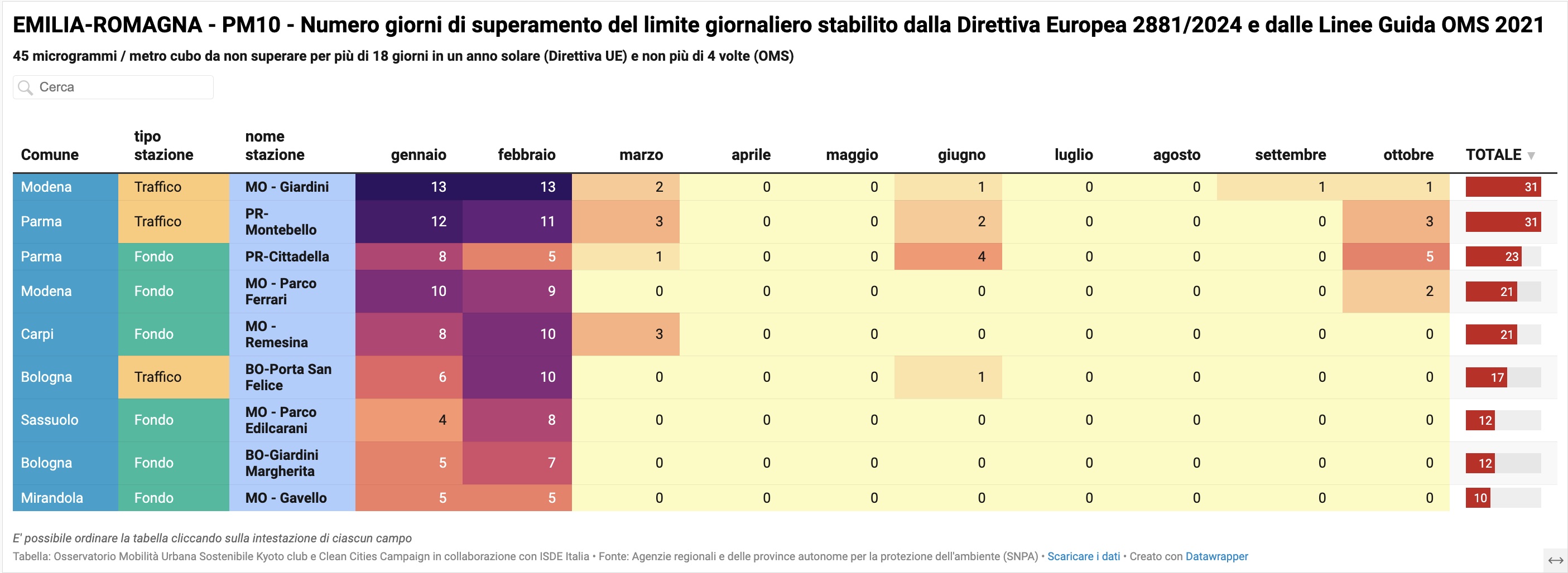 - EMILIA-ROMAGNA – PM10 – Numero giorni di superamento del limite giornaliero stabilito dalla Direttiva Europea 2881/2024