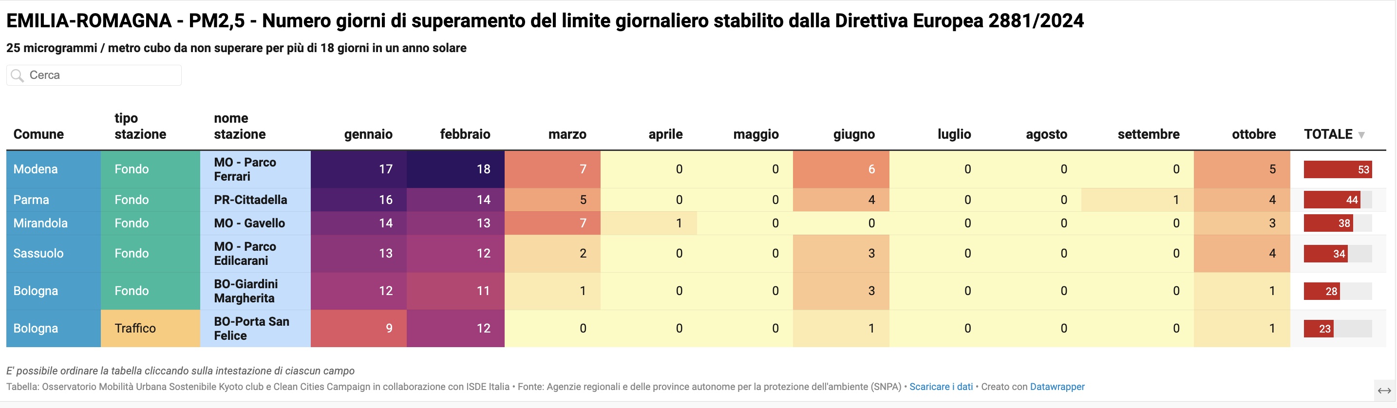 - EMILIA-ROMAGNA – PM2,5 – Numero giorni di superamento del limite giornaliero stabilito dalla Direttiva Europea 2881/2024